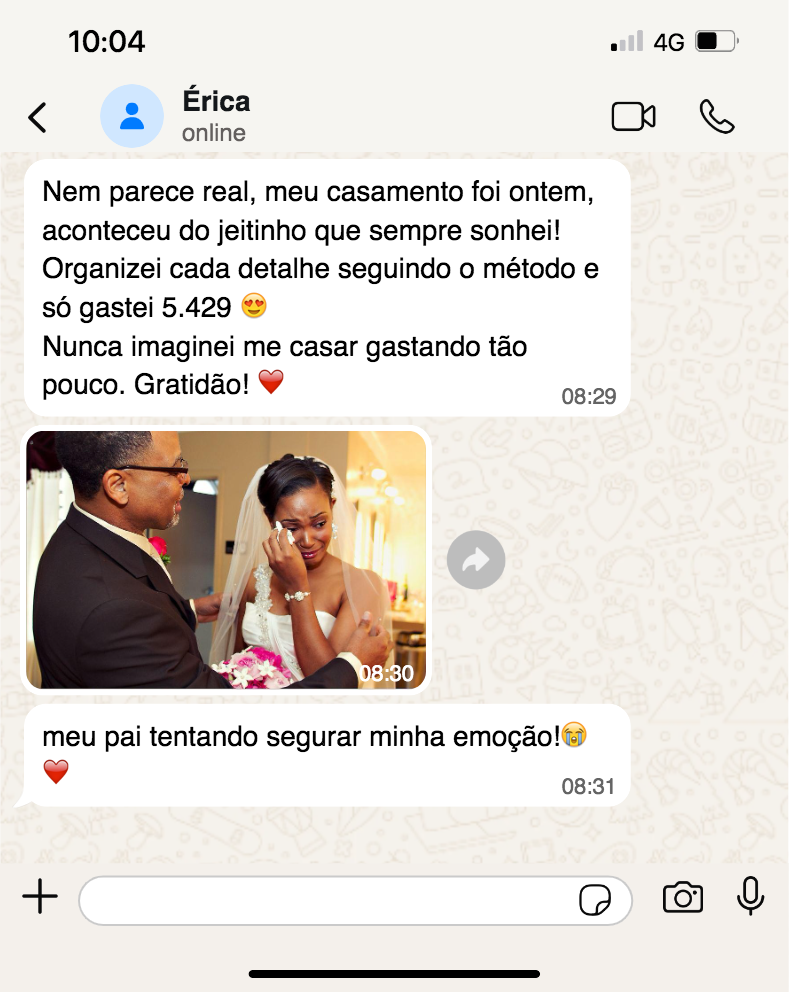 Hoje, reúno toda essa experiência dentro do "Casar Gastando Pouco 4.0" um passo a passo simples e acessível, para que qualquer pessoa consiga planejar um casamento perfeito!