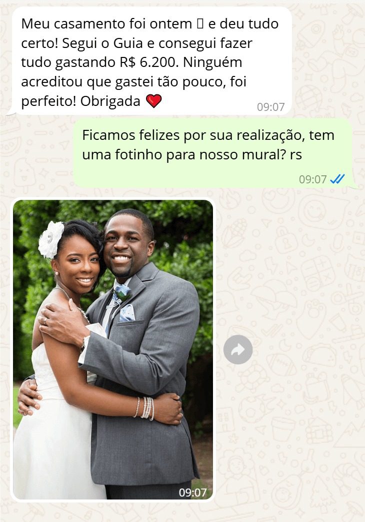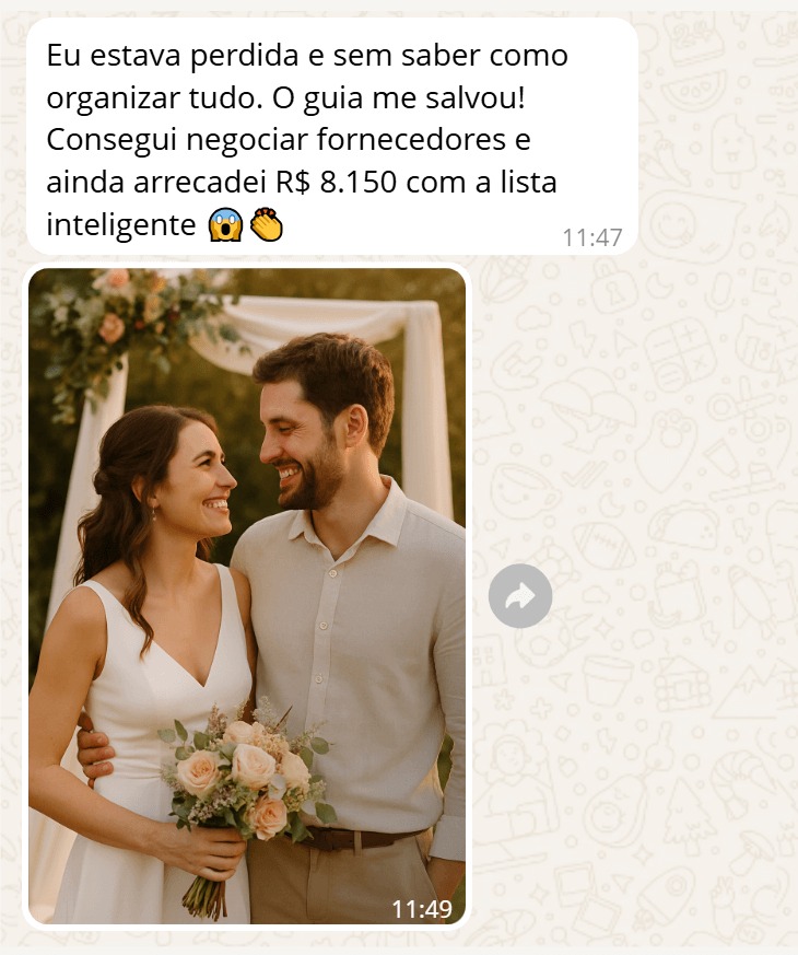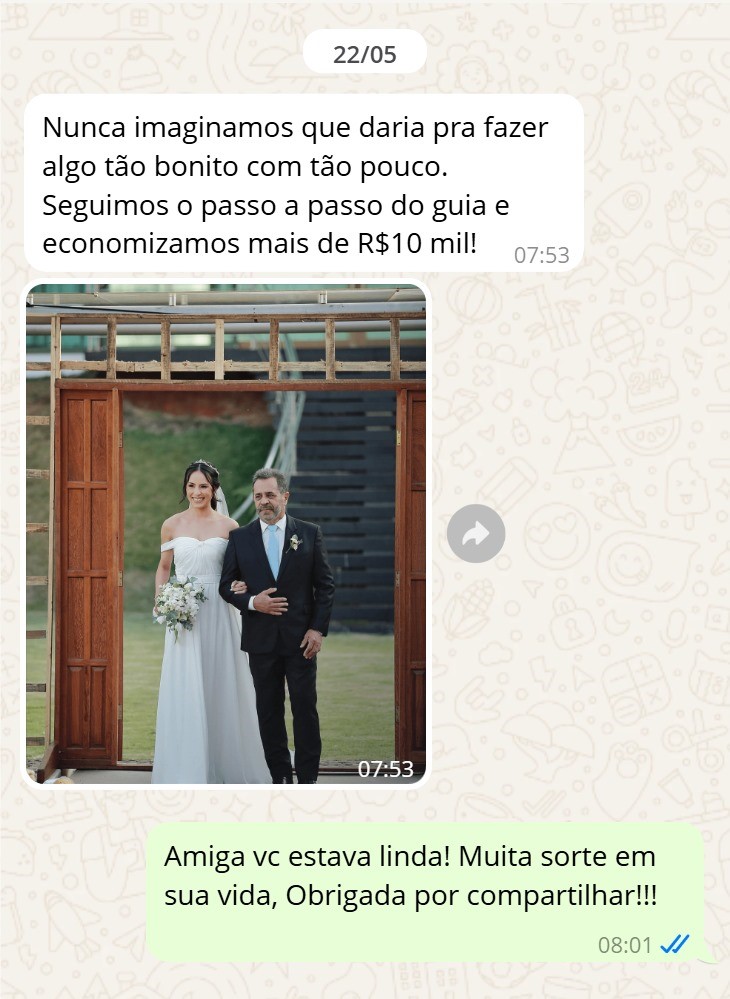 Meu maior medo era endividar logo no começo da vida juntos. Graças ao guia, consegui economizar mais de R$ 4.000 no buffet e ainda sobrou dinheiro para viajar na lua de mel.”