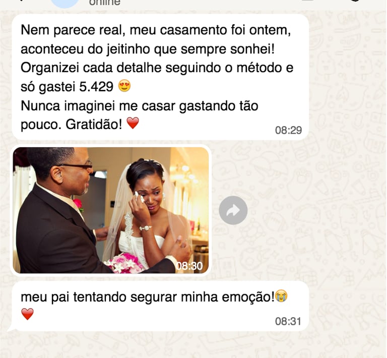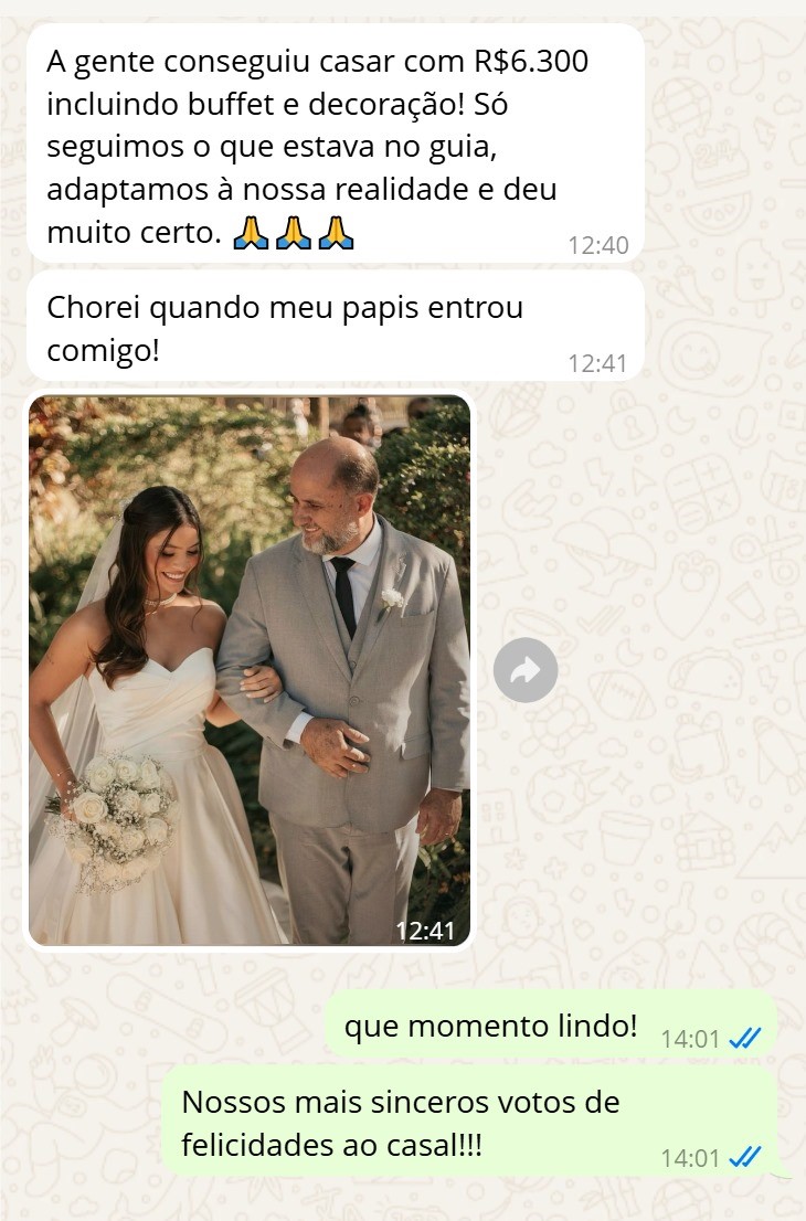 "Achei que nunca conseguiria casar com pouco dinheiro, mas com o Casar Gastando Pouco consegui organizar meu casamento gastando menos de R$ 6.500. A planilha foi essencial, e o checklist me salvou de esquecer coisas importantes!”