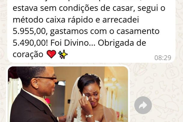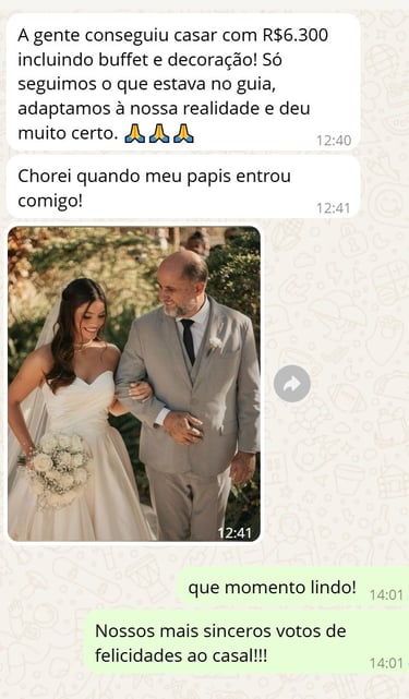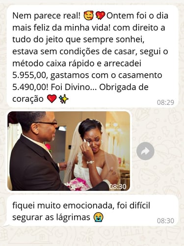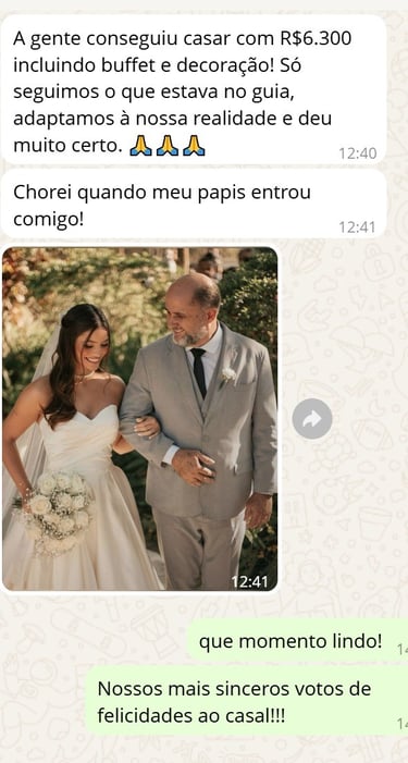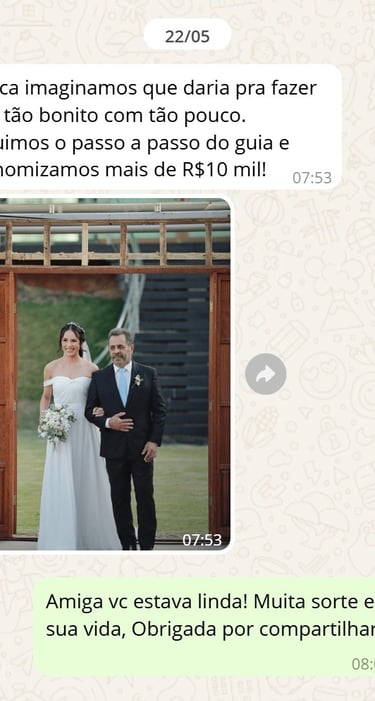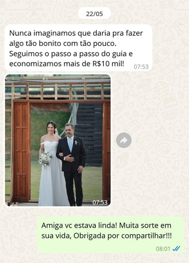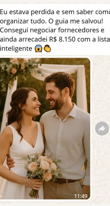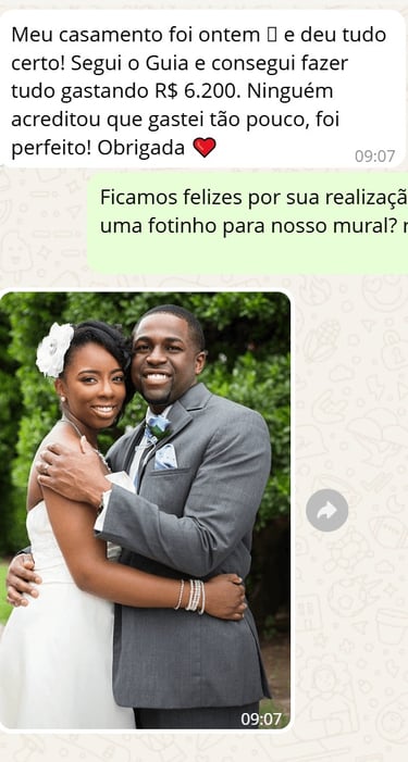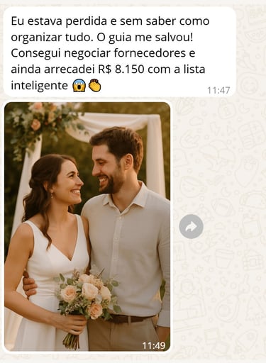 "Achei que nunca conseguiria casar com pouco dinheiro, mas com o Casar Gastando Pouco consegui organizar meu casamento gastando menos de R$ 6.500. A planilha foi essencial, e o checklist me salvou de esquecer coisas importantes!”