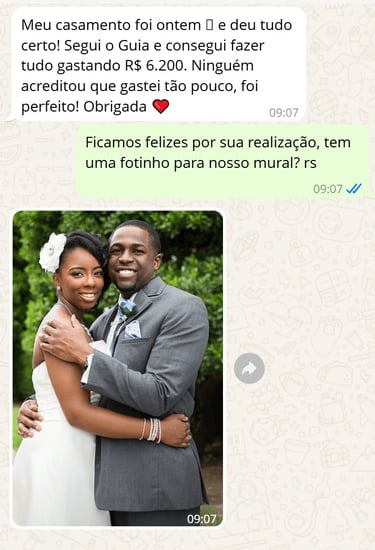Meu maior medo era endividar logo no começo da vida juntos. Graças ao guia, consegui economizar mais de R$ 4.000 no buffet e ainda sobrou dinheiro para viajar na lua de mel.”